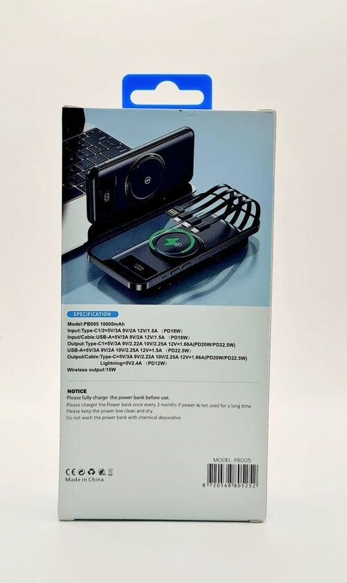 De EISENZ PB005 Powerbank 10000mAh is de ideale all-in-one oplossing voor iedereen die onderweg nooit zonder stroom wil zitten. Deze premium powerbank is uitgerust met vier ingebouwde laadkabels, draadloos opladen (15W) en ondersteunt 22W Fast Charge via USB-C en USB-A. Je hebt dus altijd de juiste kabel bij de hand — ideaal voor iPhone, Samsung, Android, tablets, earbuds en meer.